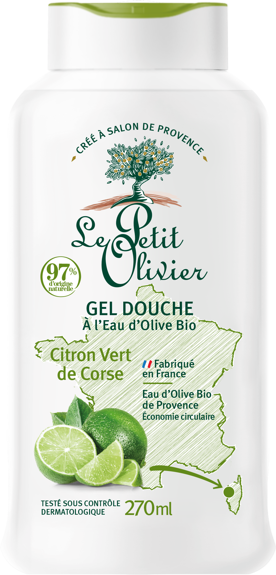 Gel de Duș Hidratant LE PETIT OLIVIER cu Apă de Măsline BIO și Lămâie Verde din Corsica, 270ml – Prospețime Mediteraneană și Vitalitate