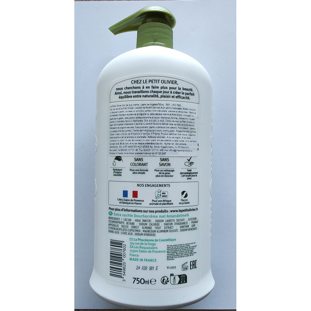 Gel de Duș Cremă LE PETIT OLIVIER cu Lapte de Migdale, 750ml  Hidratare și Delicatețe pentru Întreaga Familie